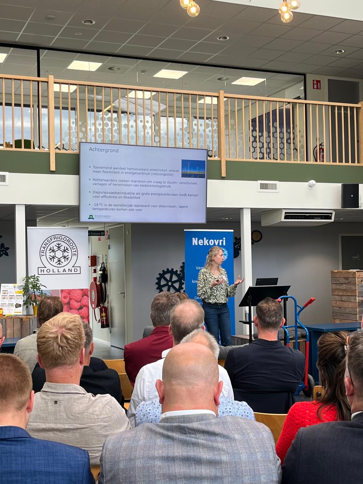 dr. Rian Timmermans, onderzoeker en projectleider Food Technologie bij de WUR (Wageningen University & Research), presenteerde het onderzoeksproject FROSTEQ (Frozen Safety, Temperature, Energy & Quality), waarvan Nekovri penvoerder is. Het onderzoek richt zich op de huidige (wettelijke) standaard van –18 °C voor opslag en transport in de diepvriesketen en of deze standaard herzien kan worden. Kan het ook op –14, -15 of -16 °C?
